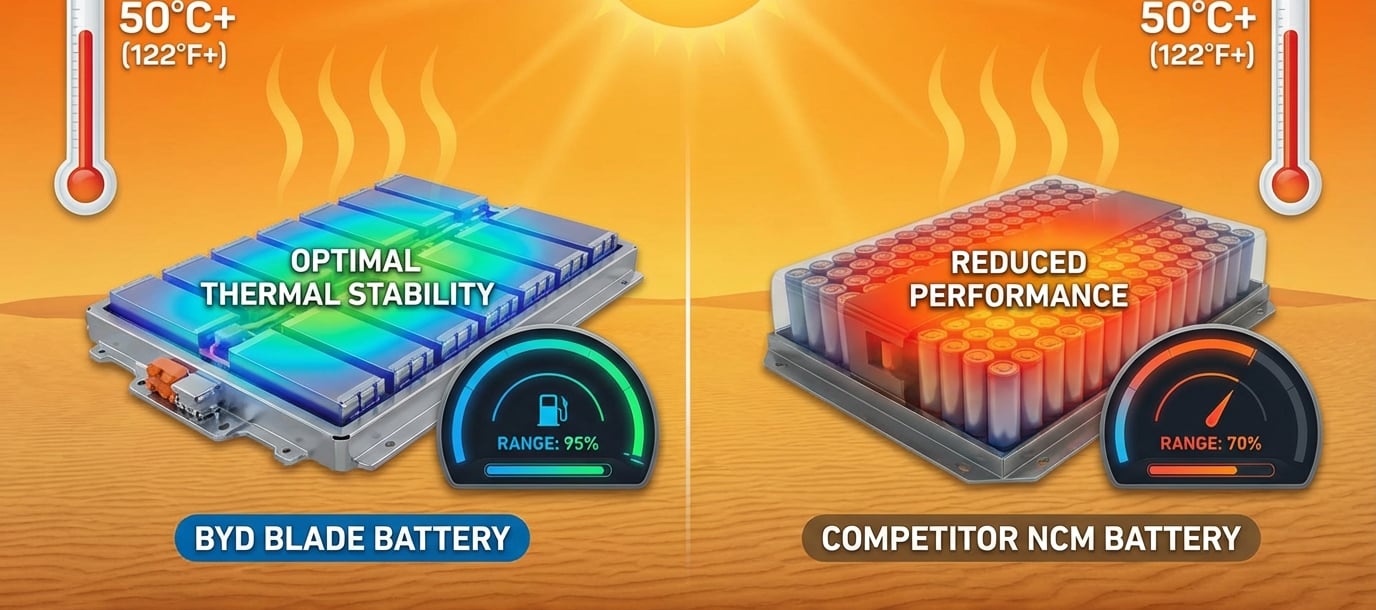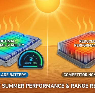 Батериите на BYD, по-специално технологията Blade Battery, са проектирани да се представят изключително добре при екстремни летни температури, надминавайки много от своите конкуренти по отношение на термична стабилност и запазване на пробега.