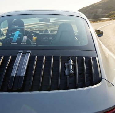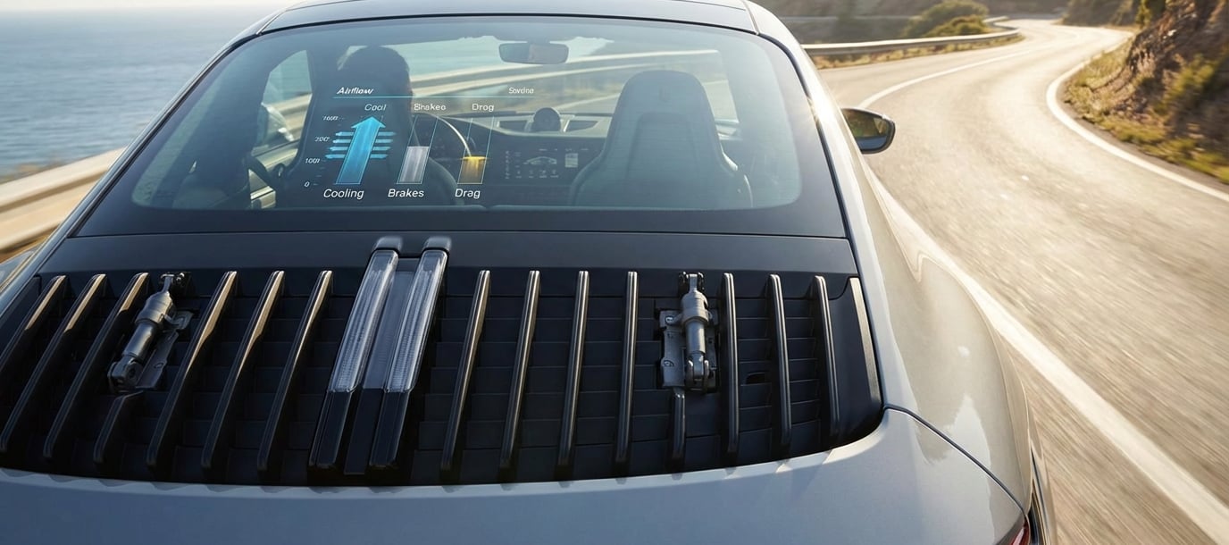 • Активни охлаждащи жалузи: При Porsche 911 GTS се използват вертикални пластини в носа, които ECU управлява автоматично, за да балансира между охлаждане на радиатора, спирачките и аеродинамичната устойчивост.